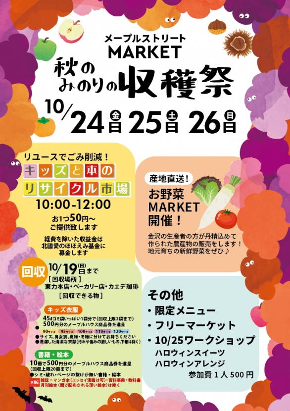 ハロウィンワークショップや地元採れたて野菜の販売、秋の新メニューの販売など実りの秋を楽しむイベント満載♪