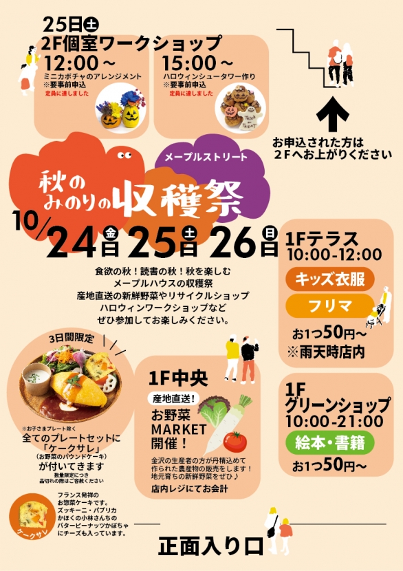 ハロウィンワークショップや地元採れたて野菜の販売、秋のお野菜ケークサレなど実りの秋を楽しむイベント満載♪