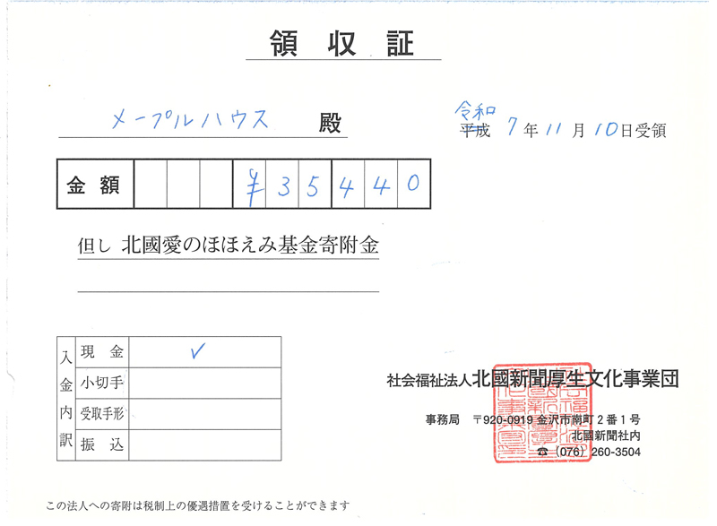 北國新聞厚生文化事業団へ寄付いたしましたのでご報告申し上げます。